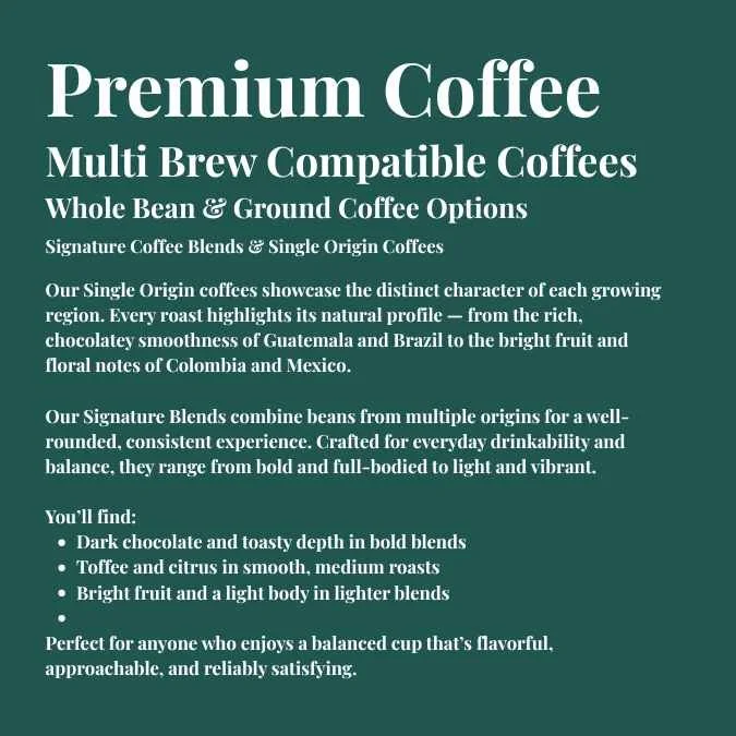 It offers harmonious toffee, dark chocolate, and citrus notes in a perfectly balanced cup. Sourced from Brazil (Cerrado), Colombia (Huila/Cauca), Guatemala (Antigua/Huehuetenango), and Ethiopia (Guji), it includes a range of altitudes (900–2,100 MASL) and processing methods.