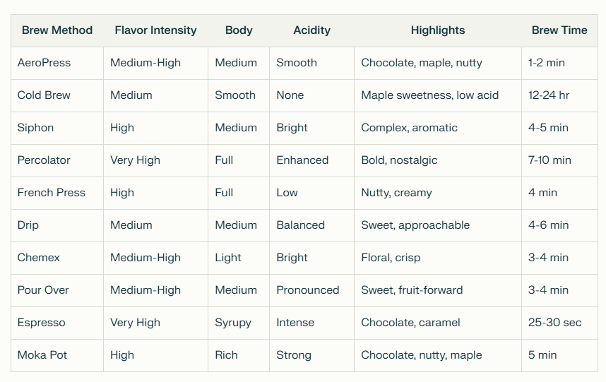 Roasted for AeroPress: Medium roast tailored for AeroPress extraction, highlighting chocolate, nutty, and maple syrup notes.